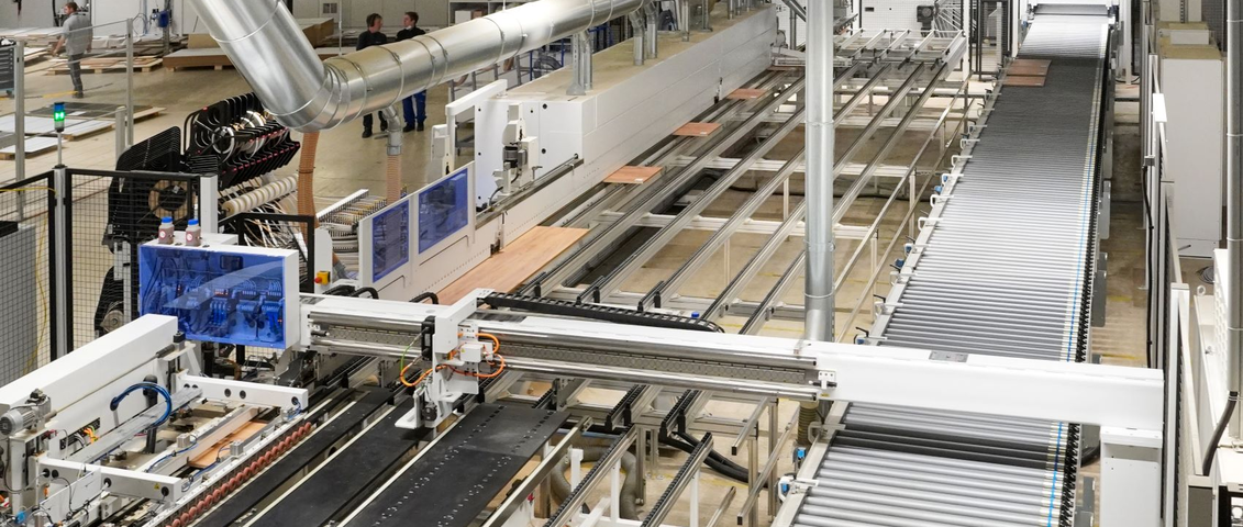 дава възможност за обработка на всичките им страни. Внимателното транспортиране на плоскостите с помощта на плот с въздушна възглавница, инсталацията за вакуумно повдигане и ролковите транспортьори обезпечават перфектни повърхности на готовите мебелни компоненти.