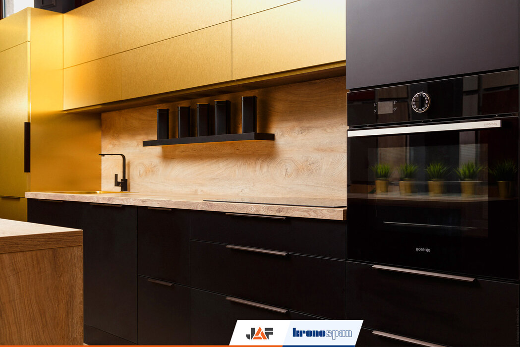 Меките, златисти оттенъци на металния декор и дълбочината в черните матови повърхност създават красива игра на светлина и текстури. Блясъкът на златото е подчертано от кадифеното присъствие на черния декор, а контрастът се балансира от топлината и дървесния фладер на работен плот и гръбче в K107 Elegance Endgrain Oak. Изящният перпендикулярен профил на плота и дискретните дръжки на долната линия от шкафове напомня за минималистичния стил в дизайна. Крайният резултат е модерна съблазън, обединяваща чистотата на формите и експресията на материала.