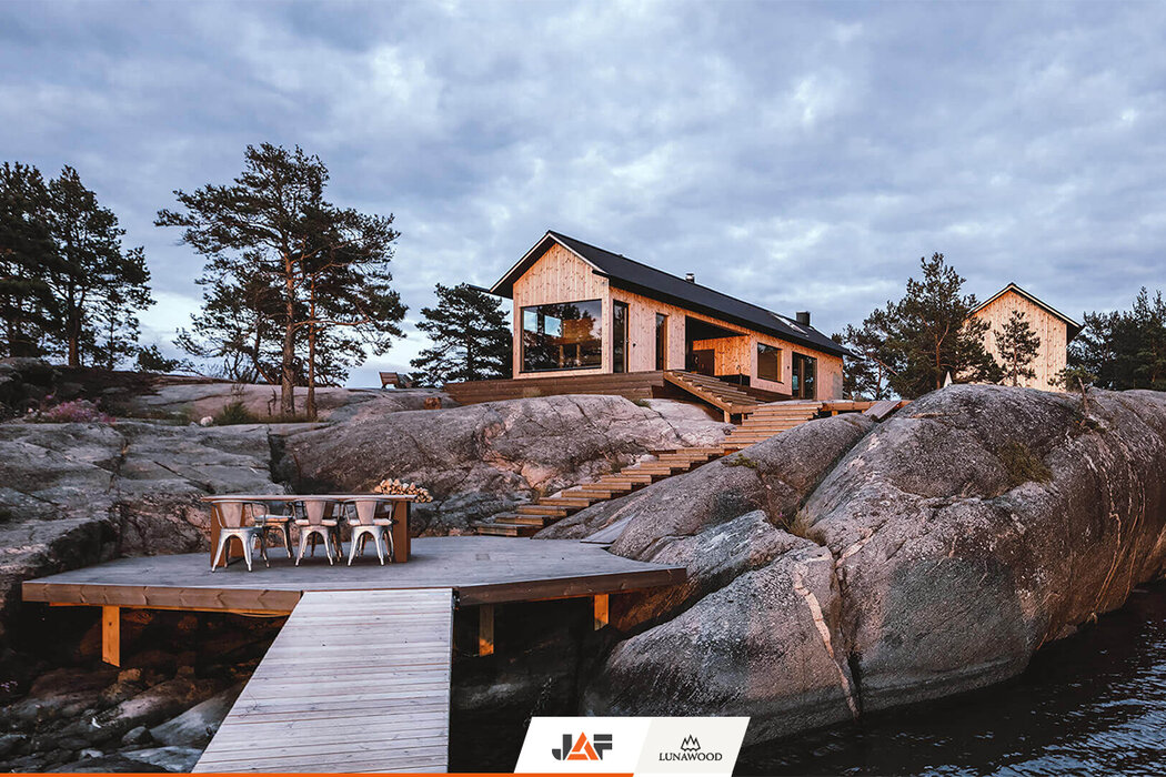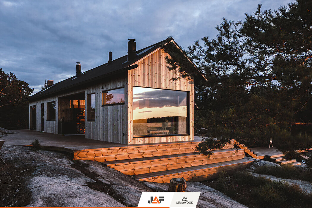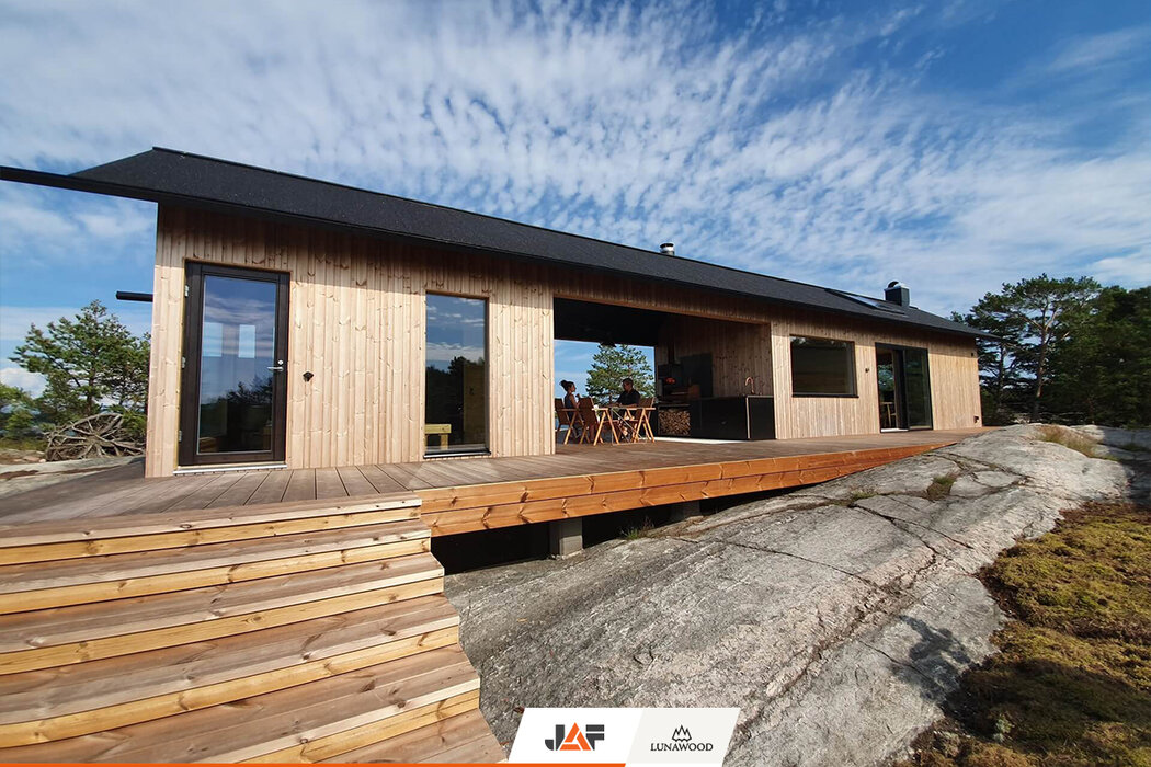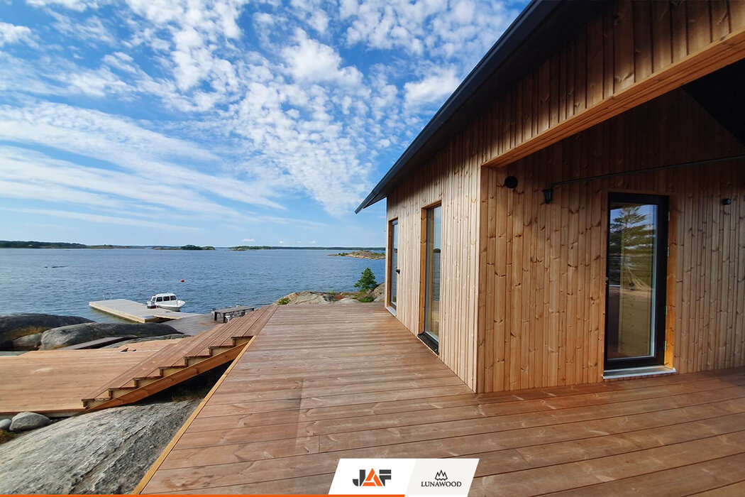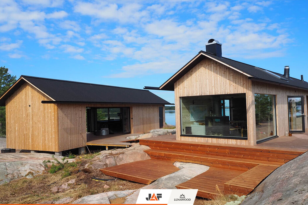 В търсене на подходящ дървесен материал за външната обшивка, терасите и интериора, която не само да се вписва хармонично в концепцията на околното пространство, но и да издържа на изключително суровите природни условия на скандинавския север, семейството се спира на термодървесината на Lunawood. В следствие на термичната модификация екологичните профили от PEFC сертифициран финландски бор и смърч демонстрират особена дименсионална стабилност и устойчивост на гниене без влагане на химикали. Подходящи са за екстериора, интериора и всякакъв тип климат. В конкретния случай вертикалната ориентация на фасадата подчертава търсения модерен, минималистичен дизайн на двете къщи.
