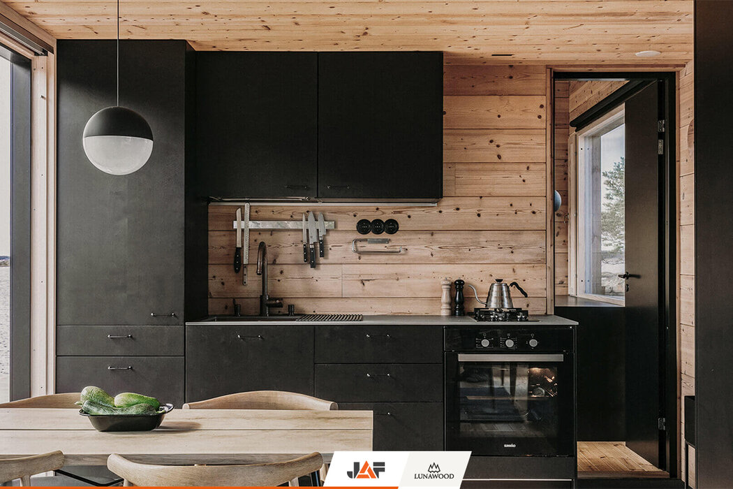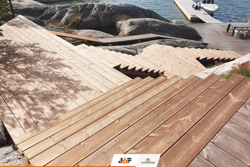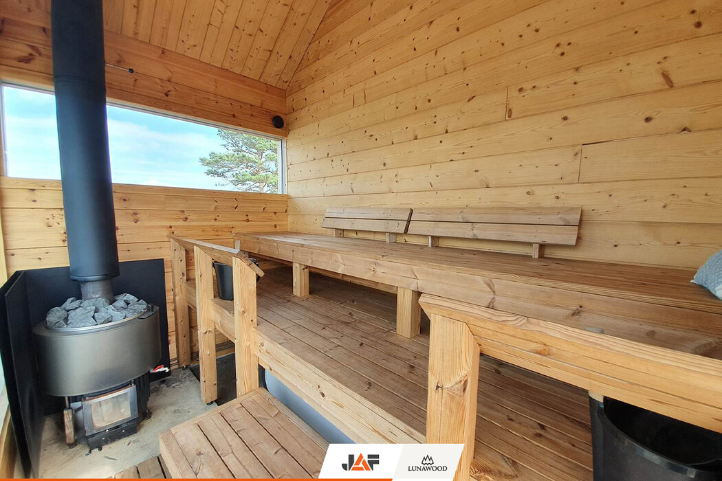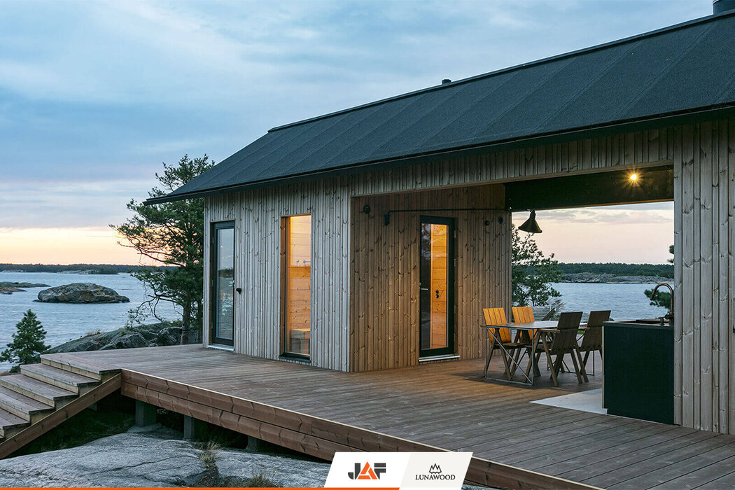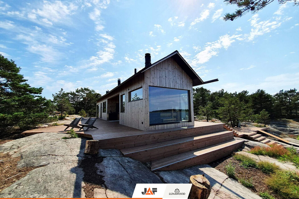 В търсене на подходящ дървесен материал за външната обшивка, терасите и интериора, която не само да се вписва хармонично в концепцията на околното пространство, но и да издържа на изключително суровите природни условия на скандинавския север, семейството се спира на термодървесината на Lunawood. В следствие на термичната модификация екологичните профили от PEFC сертифициран финландски бор и смърч демонстрират особена дименсионална стабилност и устойчивост на гниене без влагане на химикали. Подходящи са за екстериора, интериора и всякакъв тип климат. В конкретния случай вертикалната ориентация на фасадата подчертава търсения модерен, минималистичен дизайн на двете къщи.