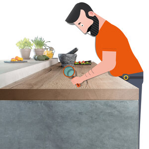 За да подсилим автентичното излъчване, комбинирахме плоскостите с кант, изобразяващ челен срез на дърво. По този начин готовите мебели бяха отличими от масивни само от набито око. От друга страна, за разлика от естествената дървесина, плотът Feelwood е много по-устойчив на петна, надраскване и удари от твърди предмети. И при всички положения –по-хигиеничен и лесен за почистване и поддръжка: достатъчни са кухненска гъба и конвенционален препарат. Младото семейство щеше да му се радва и да го ползва безгрижно вместо да му трепери. А на гостите спокойно може да казва, че обзавеждането е масивно. :)