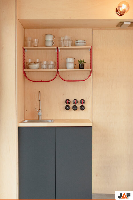 „Cabin N" е изградено от 98% възобновяеми материали, сред които, разбира се, елитна дървесина от ЙАФ: фасада от термобор Lunawood, омаслена в стилен цвят защитно натурално масло Rubio Monocoat, интериорни обшивки от декоративен брезов шперплат, декинг термоясен за пода на банята и KVH греди за покривната конструкция. „Cabin N" е разработено за почитателите на глемпинг туризма, търсещи комбинация от комфорт и максимална близост до природата. И в този проект философията на създателите му е ясно разпознаваема: елитното бунгало съчетава в себе си стилен минимализъм с екологично съзнание.