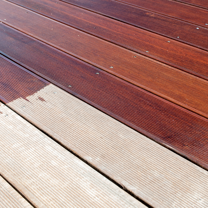 Старателното отстраняване на мръсотията и зеления налеп по декинга е важно за добрия резултат от омасляването. Най-удобно е, ако разполагате с водоструйка, но и обикновен градински маркуч и четка вършат работа. Относно препаратите – съветвам Ви да избягвате конвенционални домакински препарати. Някои от тях съдържат агресивни съставки, които могат да доведат до нежелани резултати. Почистващите препарати за дърво са правилният избор.