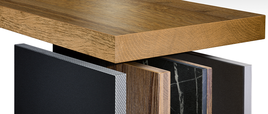 Особено разширение на гамата се забелязва при плотовете. Сред актуалните модели откриваме много нови репродукции на камък, бетон, метал, керамика и, разбира се, дърво. Най-взискателните клиенти със сигурност ще оценят декорите, създадени без повторение на шаблона по цялата над четириметрова дължина на плота. Освен с нови декори, асортиментът от плотове е обогатен и откъм материали: за първи път производителят включва в него модели от компактен ламинат с дебелина 12 мм. Особено елегантно решение е и серията PerfectSense Topmatt с носеща плоскост от 16 мм MDF.