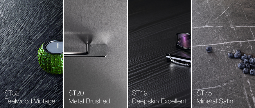 Въплътената в декорите емоция е подсилена допълнително от изразената сетивност на повърхностните структури. Сред тях се открояват новите попълнения ST32 Feelwood Vintage, ST19 Deepskin Excellent, ST20 Metal Brushed и разработената специално за плотове ST75 Mineral Satin. Структурите от серията Feelwood се отличават с изразителност, автентично усещане при допир и синхронност с дървесните линии на декора. Редувайки матови и гланцови дървесни линии, структурите Deepskin, от своя страна, придават вълнуващ и същевременно естествен характер на декора. Metal Brushed е специално предложение за почитателите на четкани метални повърхности. За разлика от него, Mineral Satin се отличава с характерната за мрамора неравномерност и придава матово излъчване и кадифено усещане на едноцветните и каменните декори.
