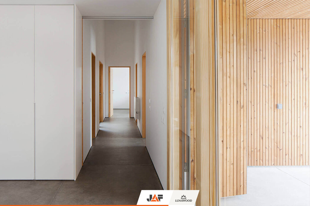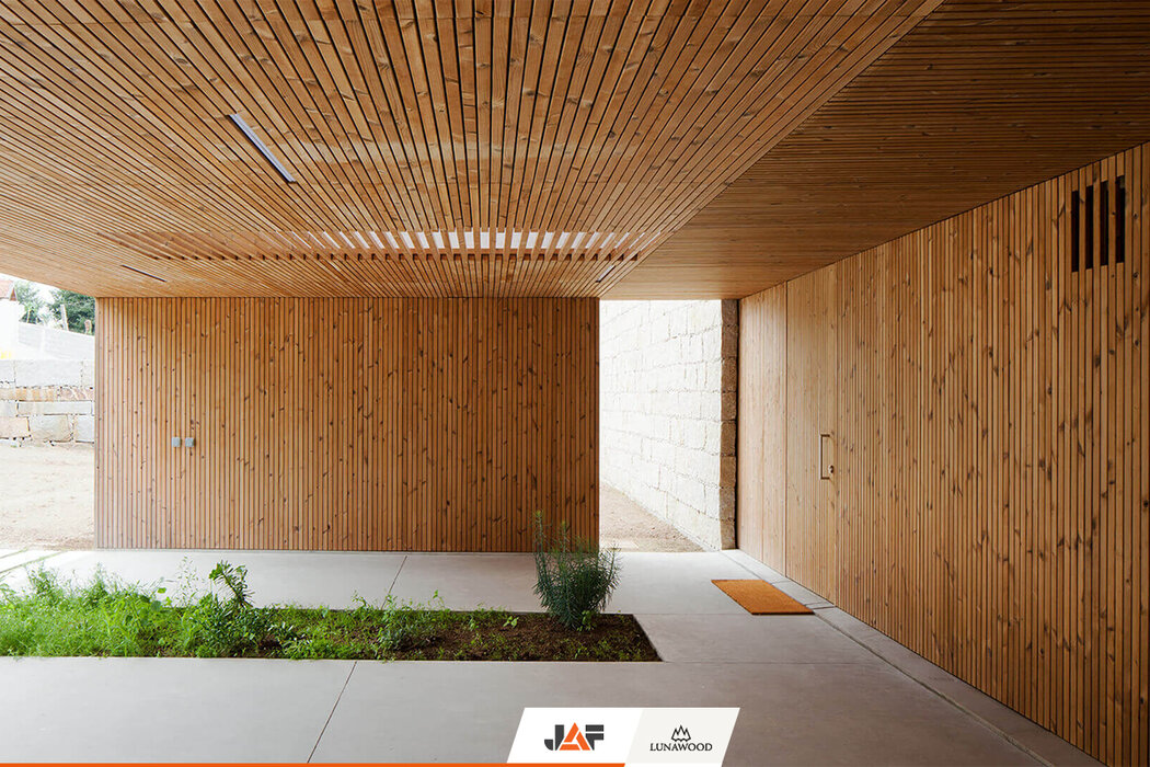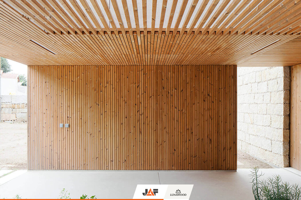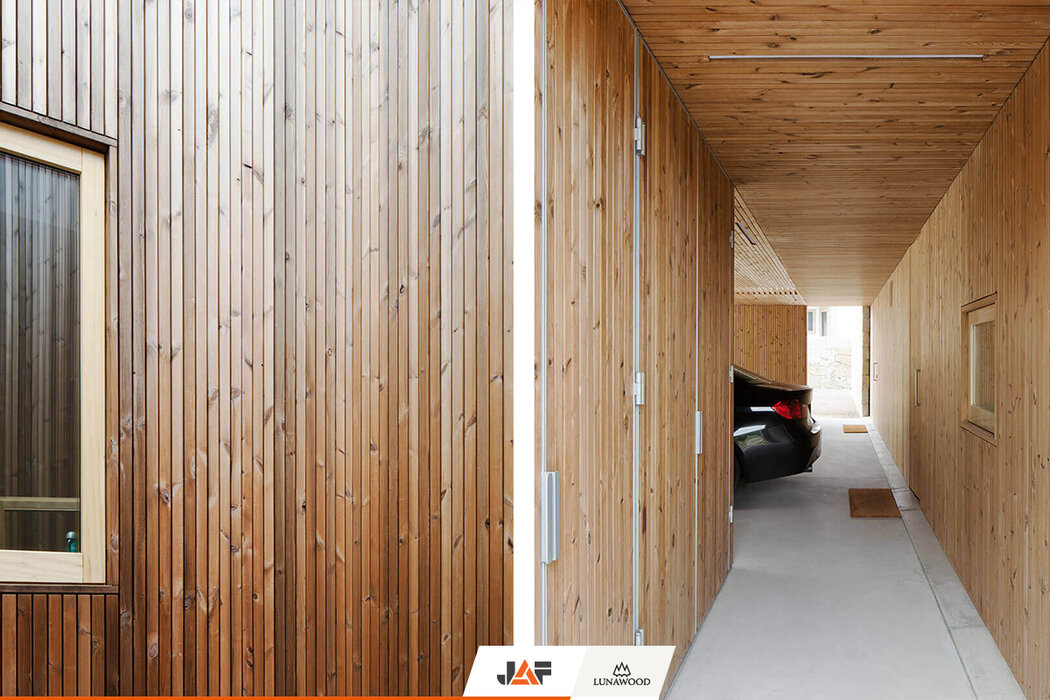 Тази модерна еднофамилна къща се намира в покрайнините на Пенафиел в Португалия – традиционен земеделски район. Избраните естествени материали като термодървeсина и гранит са израз на уважение към местните традиции. Изчистената фасада от тесни вертикални профили на Lunawood придава на сградата актуален, съвременен вид. С годините под въздействието на слънчевата светлина тя ще придобива по естествен път благороден, непреходен сив нюанс.