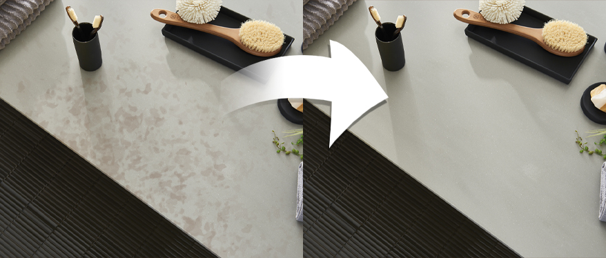 Въпреки че не ми е за пръв път, изпитах истинско удивление как след толкова години захабени повърхности възвръщат първоначалния си външен вид. Дори нещо повече: в зависимост от това колко фино полирате, може да получите според предпочитанията на клиента матова или гланцова повърхност. И всичко се постига с такава лекота! Вярно, при по-дълбоки драскотини се налага да се постараете повече, да изшлайфате първо с по-едро зърно, но в крайна сметка резултатът е на лице. Това е възможно, защото, за разлика от ламинираните повърхности, цветовете на Corian проникват в цялата му дълбочина. Затова и материалът позволява и безпроблемно фрезоване, рязане, всякакви ерове и, разбира се, незаменимото невидимо слепване на елементи.